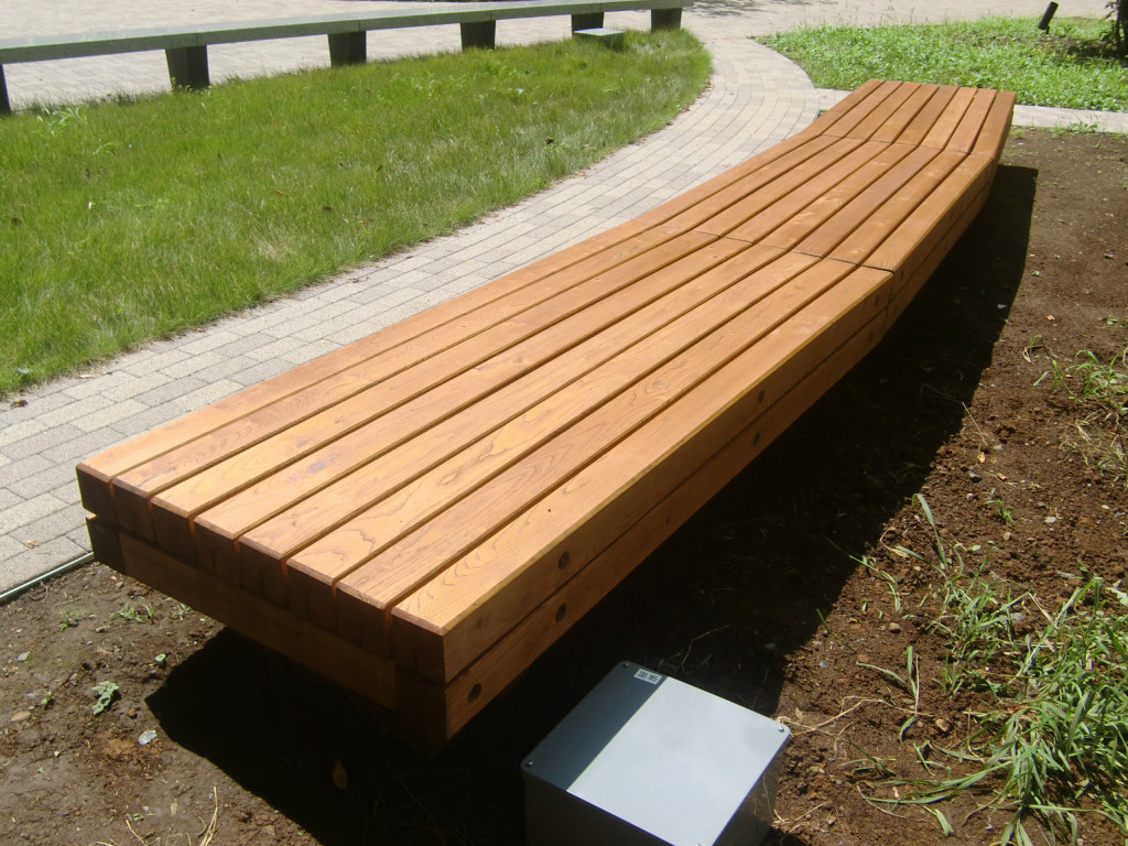 東京都豊島区の学習院大学構内に7基のベンチを円形に配置いたしました。材料:国産クリ材施工:2022年8月